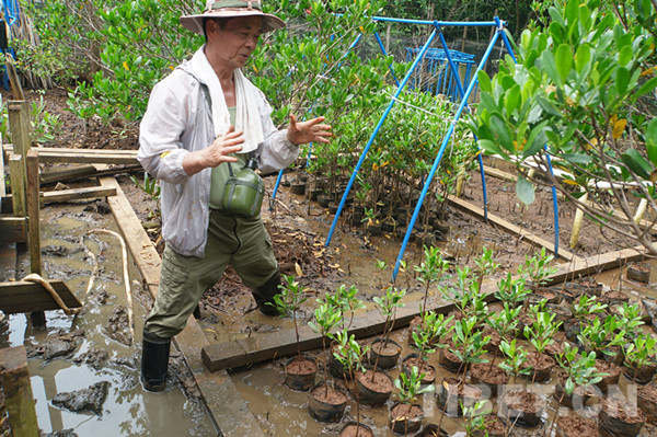 紅欖李,屬珍稀瀕危種,在中國只有9枝母株,現(xiàn)存活在三亞鐵爐港。為了保護(hù)這種瀕危植物,今年62歲的王式軍退休后又回到了保護(hù)區(qū),培育出700多株新一代紅欖李。圖為王式軍在培育地里管理育苗。