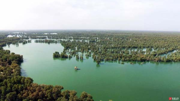 補(bǔ)水后的輪臺縣胡楊林公園。圖/塔里木河流域管理局