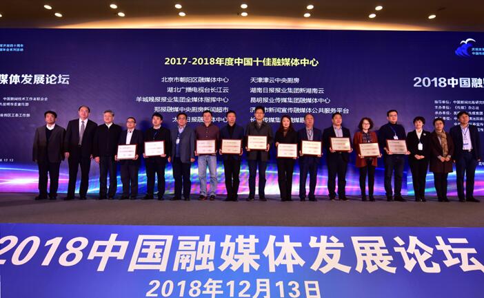 論壇上,還進行了2017-2018年度中國十佳融媒體中心授牌儀式,北京市朝陽區(qū)融媒體中心、天津津云中央廚房、昆明報業(yè)傳媒集團融媒體中心等10家單位入選。