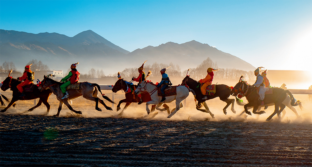 2月7日,騎手在拉薩北郊賽馬場上進行民間賽馬活動和傳統(tǒng)馬術(shù)表演 普布扎西攝
