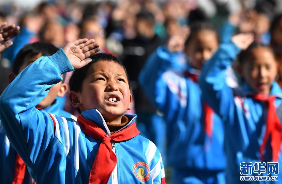 3月4日,在拉薩市第一小學,少先隊員在升國旗儀式上向國旗敬禮。新華社記者 覺果 攝