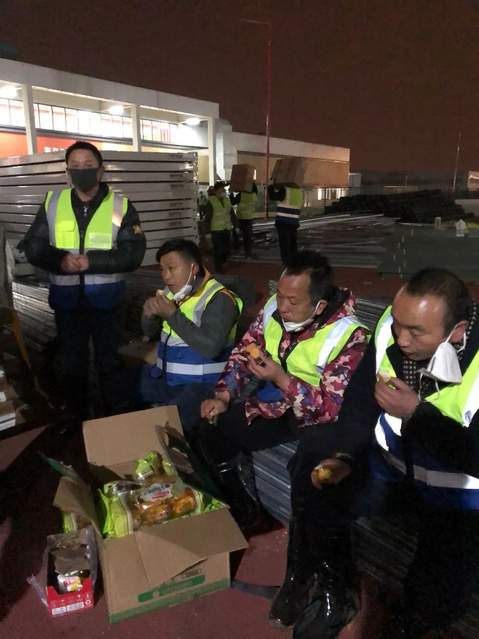 零點的夜色里,工人師傅抽空吃點東西。一天兩班倒,吃點東西更有力量加油干。