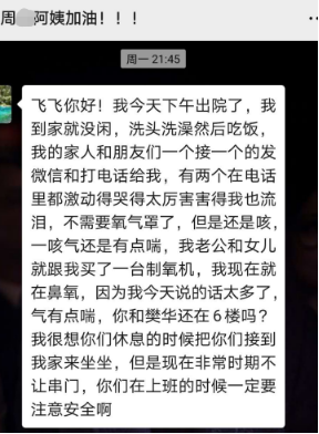 阿姨在微信里說,“飛飛,我今天下午出院了。家人和朋友們一個(gè)接一個(gè)的發(fā)微信和打電話給我,有兩個(gè)在電話里都激動(dòng)得哭的太厲害,害得我也跟著流淚。我現(xiàn)在不需要氧氣罩了,但還是喘,偶爾也會(huì)咳,我老公和女兒就給我買了一臺(tái)制氧機(jī),我現(xiàn)在就在吸著鼻氧,因?yàn)槲医裉煺f的話太多了,氣有點(diǎn)喘。我很想你們!