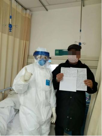 43床的患者,從我們醫(yī)療隊(duì)進(jìn)駐開始,他就是重點(diǎn)觀察對(duì)象,我眼看他從病重到病危再到有所好轉(zhuǎn)。前一段時(shí)間,他的病情又突然惡化,他卻依然頑強(qiáng)地與病魔搏斗,甚至采取俯臥位通氣的方式也要堅(jiān)持下去。我有時(shí)也想,如果換作是我,也許沒有這么堅(jiān)強(qiáng)的毅力撐這么久。他甚至已經(jīng)寫下了遺書,歪斜的字體能勉強(qiáng)認(rèn)出:“我的遺體捐國家。”我瞬時(shí)淚目。他還多次拒絕過服藥,他說留給需要的人吧。醫(yī)療團(tuán)隊(duì)當(dāng)然不放棄希望,不停地聯(lián)系床位和協(xié)調(diào)120,終于等來了好消息:金銀潭有了一個(gè)床位,可120的設(shè)備卻還沒有到位。沒有無創(chuàng)呼吸機(jī),我們就用自己的!沒有氧氣筒,我們自己扛下去,一個(gè)不行,我們扛兩個(gè)!就這樣,患者終于安全順利地抵達(dá)了金銀潭醫(yī)院!還記得那天下班,到達(dá)酒店房間,我一屁股坐在行李箱上,突然間就淚流滿面。