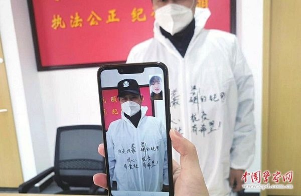 民警洪慧鵬寫在防護(hù)服的話是他送給妻子的“禮物”。 (武漢市公安局供圖)