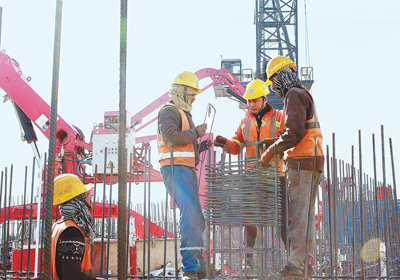 圖為埃及新首都中央商務(wù)區(qū)“標(biāo)志塔”工程施工現(xiàn)場,中埃兩國項目員工共同綁扎鋼筋。