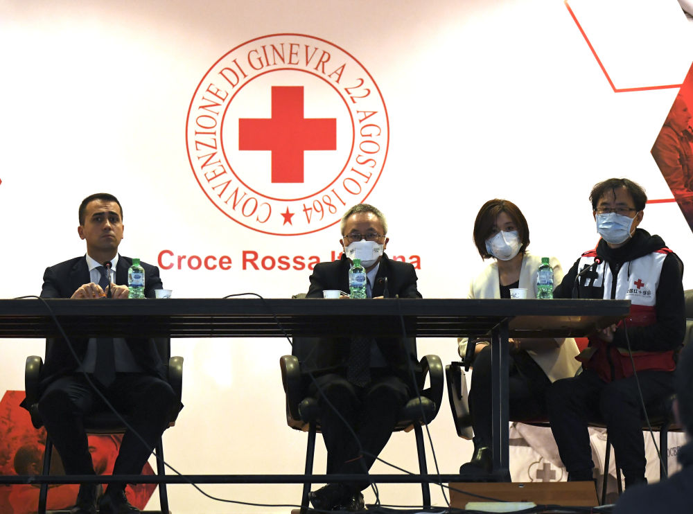 3月13日,在意大利首都羅馬,意大利外長(zhǎng)迪馬約(左一)與中國(guó)抗疫醫(yī)療專家組成員(右一)出席新聞發(fā)布會(huì)。 新華社發(fā)(阿爾貝托·林格利亞攝)