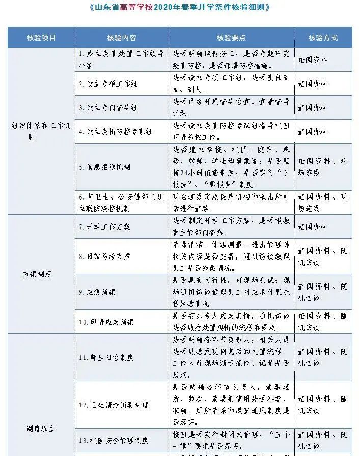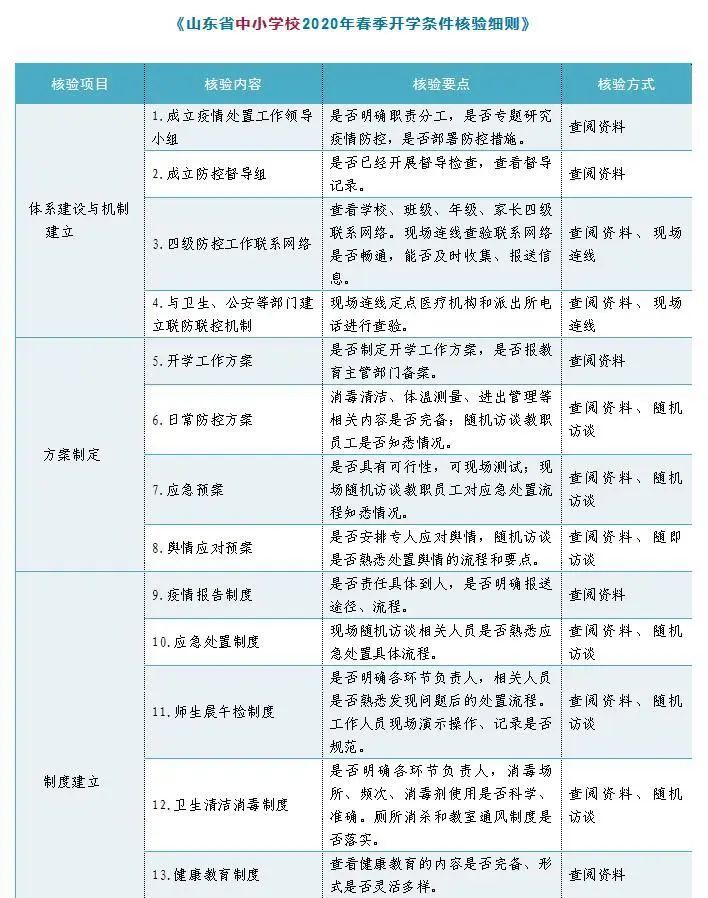 山東省教育廳、省衛(wèi)生健康委、省市場監(jiān)管局聯(lián)合制定《山東省中小學(xué)校2020年春季開學(xué)條件核驗細(xì)則》《山東省高等學(xué)校2020年春季開學(xué)條件核驗細(xì)則》。要求各級教育部門會同衛(wèi)生健康、市場監(jiān)管部門依據(jù)《核驗細(xì)則》指導(dǎo)屬地學(xué)校做好開學(xué)前的各項準(zhǔn)備工作,聯(lián)合組建檢查組,以最嚴(yán)格的標(biāo)準(zhǔn),最嚴(yán)謹(jǐn)?shù)膽B(tài)度,對屬地學(xué)校進(jìn)行開學(xué)條件核驗工作,《核驗細(xì)則》中任意一項核驗結(jié)果為“否”,即核驗不合格,不得開學(xué)。各級各類學(xué)校要對照《核驗細(xì)則》,完善防控責(zé)任體系,細(xì)化任務(wù)清單,明確責(zé)任分工,切實做好開學(xué)準(zhǔn)備工作,確保廣大師生生命安全和身體健康。