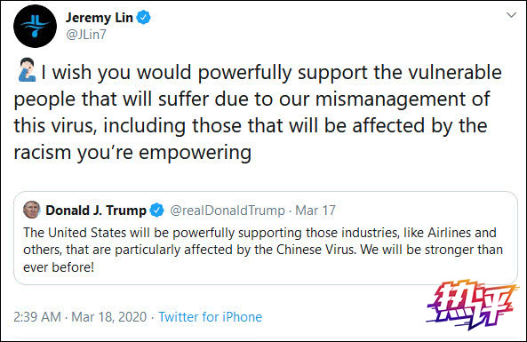 當?shù)貢r間17日,美國總統(tǒng)特朗普公然將肆虐全球的新型冠狀病毒稱作“中國病毒”,試圖甩鍋中國以擺脫美國內對其抗疫不力的指責。特朗普的無底線言論,引起海外華僑華人的堅決反對,前NBA華裔球星林書豪也連發(fā)數(shù)條推文批評特朗普的表態(tài)帶有種族歧視含義,指責美國現(xiàn)任政府的防疫工作開展不力。