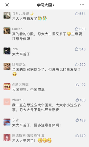 從新聞鏡頭中,有網(wǎng)友敏銳地關(guān)注到一個細節(jié):“全國新冠肺炎病例少了,總書記的白發(fā)卻多了”。很多人留言傾述自己的關(guān)切之情。
