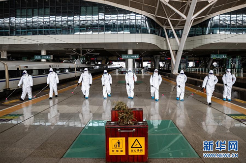 3月24日,消防員對武漢火車站站臺進行全面消殺。