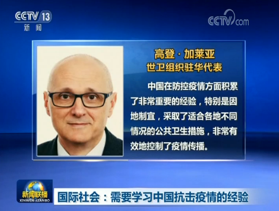 世衛(wèi)組織5日的報(bào)告援引世衛(wèi)組織駐華代表高登·加萊亞的話(huà)說(shuō),中國(guó)在防控疫情方面積累了非常重要的經(jīng)驗(yàn),特別是因地制宜,采取了適合各地不同情況的公共衛(wèi)生措施,非常有效地控制了疫情傳播。加萊亞表示,中國(guó)人民為遏制疫情傳播做出巨大努力,產(chǎn)生積極成效。各國(guó)應(yīng)共同協(xié)作分享抗疫經(jīng)驗(yàn)和疫情信息,互相借鑒學(xué)習(xí),采取及時(shí)有效的防控措施。