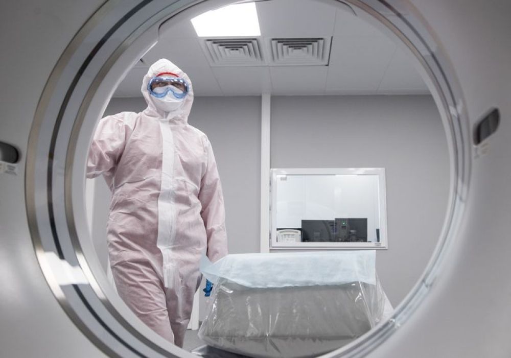 4月23日,醫(yī)護人員在俄羅斯首都莫斯科市郊新建成的傳染病醫(yī)院內(nèi)工作。(新華社/衛(wèi)星社)