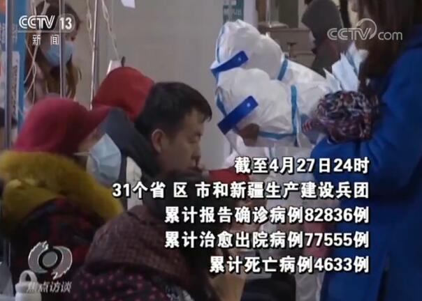 這次疫情是新中國成立以來,在我國發(fā)生的傳播速度最快、感染范圍最廣、防控難度最大的一次重大突發(fā)公共衛(wèi)生事件。截至4月27日24時,31個。▍^(qū)、市)和新疆生產(chǎn)建設(shè)兵團累計報告確診病例82836例,累計治愈出院病例77555例,累計死亡病例4633例。