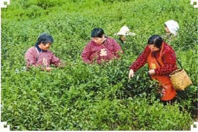貧困戶陳霞和村里姐妹們?cè)缭缵s來(lái)采摘春茶,臉上綻放著春花般幸福的笑容。“明前茶,貴如金!彼浑p手左右開(kāi)弓,不停地在茶叢中翻飛輕點(diǎn),采摘芽苞,并笑言,一季春茶采下來(lái)能增收三千多塊。