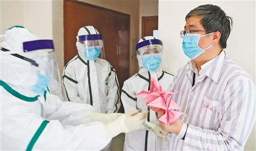 解放軍總醫(yī)院第五醫(yī)學(xué)中心感染病醫(yī)學(xué)部的醫(yī)護(hù)人員為患者送上親手制作的千紙鶴。 戴 欣攝