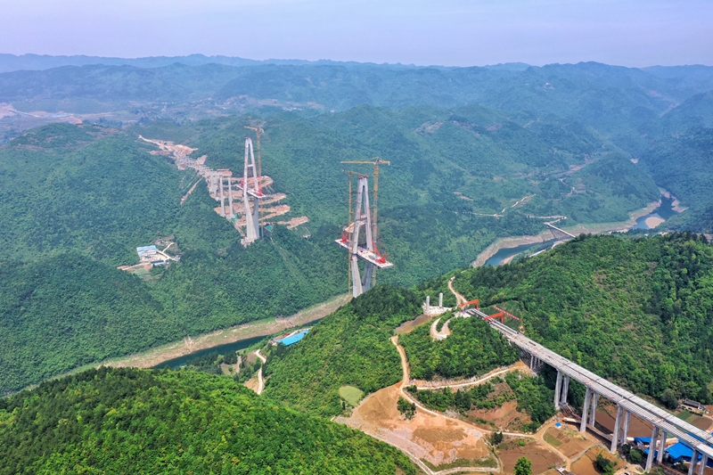 由中鐵廣州局承建的貴州遵余高速湘江大橋工程在做好疫情防控的同時,全力恢復(fù)生產(chǎn)建設(shè)。目前工程進展順利,正在進行主橋鋼梁架設(shè),預(yù)計將于8月底合龍。據(jù)了解,遵余高速湘江大橋橋梁全長1700余米,主跨560米。新華社記者 劉續(xù)/攝