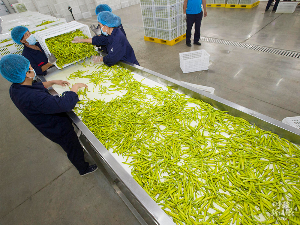 △7月中旬,山西大同黃花進(jìn)入采摘季。經(jīng)過(guò)清洗、篩選,最終由工人裝車(chē)推入烘干房。