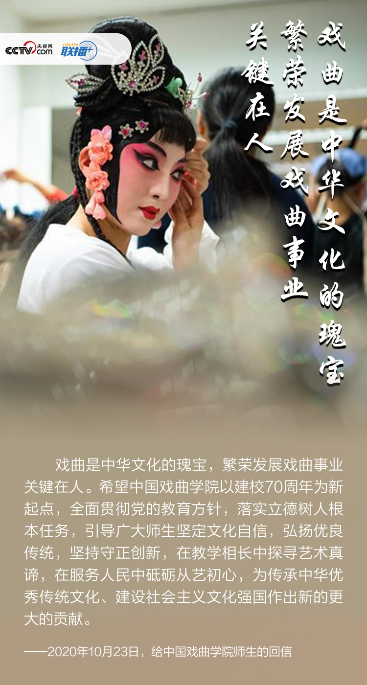 聯(lián)播+2020年10月23日,習近平總書記給中國戲曲學院師生回信時強調(diào),中華優(yōu)秀傳統(tǒng)文化不僅是歷史上中華民族戰(zhàn)勝種種艱難險阻而薪火相傳的偉大精神瑰寶,也是實現(xiàn)中華民族偉大復興中國夢的重要精神支撐。