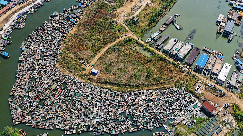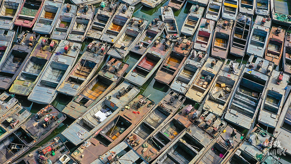 △國家實(shí)施長江流域禁捕退捕政策后,江蘇宿遷泗洪縣啟動(dòng)洪澤湖水域禁捕退捕和住家船整治工作。這是聚集在漁港等待拆解的漁船。