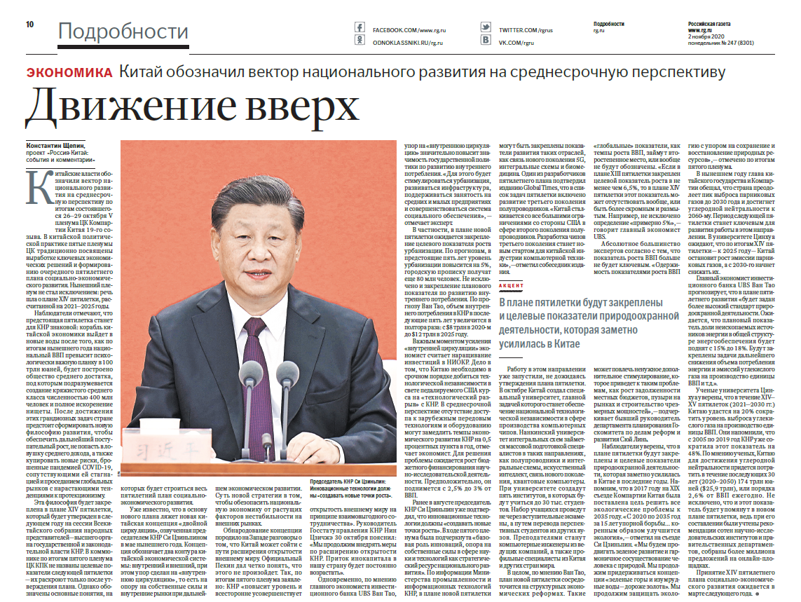 當(dāng)?shù)貢r(shí)間11月2日出版的《俄羅斯報(bào)》在《中俄銳評(píng)》專欄刊發(fā)題為《中國(guó)研究制定國(guó)家中期發(fā)展規(guī)劃 推動(dòng)經(jīng)濟(jì)社會(huì)高質(zhì)量發(fā)展》的評(píng)論文章。文章以中國(guó)共產(chǎn)黨第十九屆五中全會(huì)審議通過《中共中央關(guān)于制定國(guó)民經(jīng)濟(jì)和社會(huì)發(fā)展第十四個(gè)五年規(guī)劃和二〇三五年遠(yuǎn)景目標(biāo)的建議》為切入點(diǎn),指出中國(guó)制定的雙循環(huán)新發(fā)展格局在擴(kuò)大內(nèi)需的同時(shí)將一如既往地推進(jìn)對(duì)外開放政策。文章強(qiáng)調(diào),中國(guó)將持續(xù)加大科技創(chuàng)新投入,擺脫在某些關(guān)鍵領(lǐng)域的技術(shù)依賴。同時(shí),未來五年中國(guó)將更加重視高質(zhì)量發(fā)展與綠色發(fā)展。