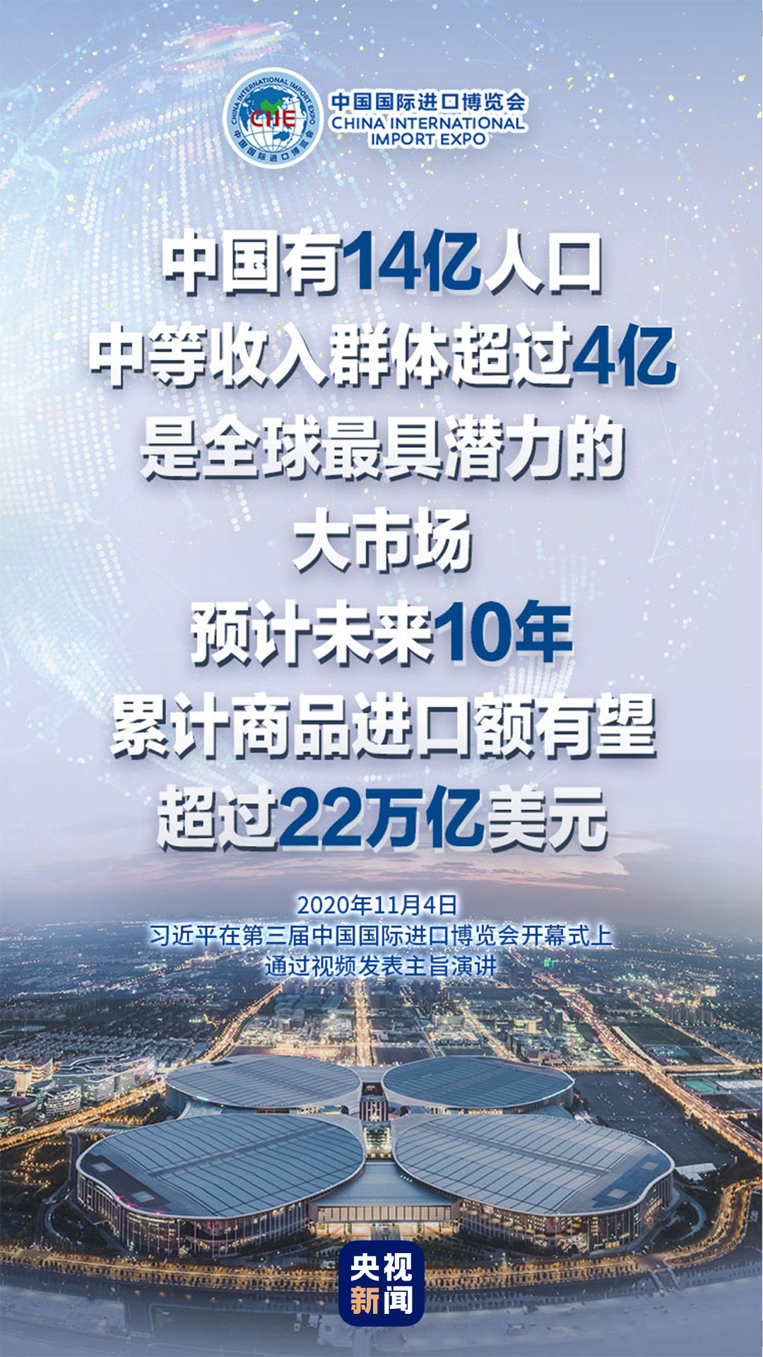 11月4日,國(guó)家主席習(xí)近平在第三屆中國(guó)國(guó)際進(jìn)口博覽會(huì)開(kāi)幕式上以視頻方式發(fā)表主旨演講。他強(qiáng)調(diào)中國(guó)將堅(jiān)定不移全面擴(kuò)大開(kāi)放,愿同世界分享市場(chǎng)機(jī)遇。開(kāi)幕式上,他的這些金句擲地有聲。