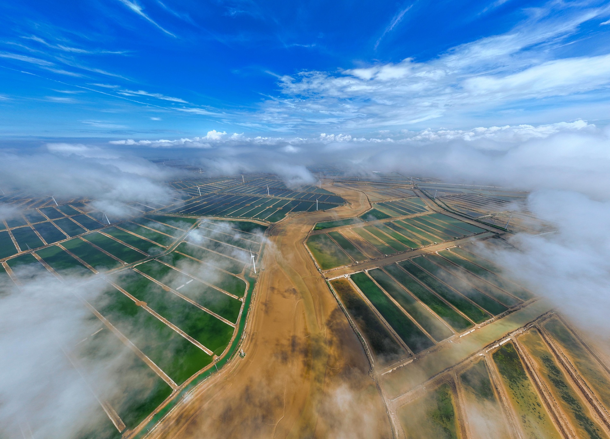 作品簡(jiǎn)介:透過(guò)漂浮的白云,可以清晰地看到地面綠色的養(yǎng)殖池和白色的風(fēng)車(chē),一條黃色的海溝從中間穿過(guò),藍(lán)天白云與地面相映互襯,景色秀美遼闊。(來(lái)源:山東省生態(tài)環(huán)境廳)