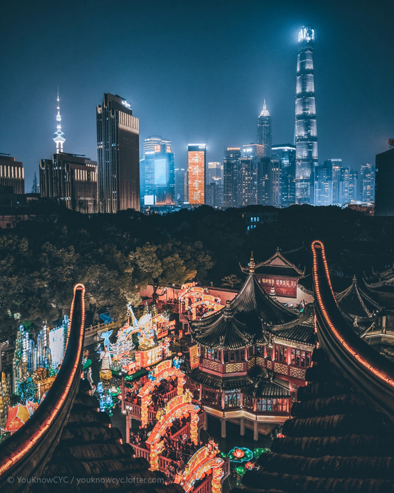 從豫園的城隍廟往黃浦江看去,歷史的美感映照著國(guó)際都市的璀璨。