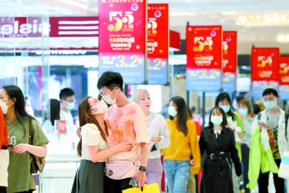 南京路商圈各商場在“五五購物節(jié)”中推出更大力度的促銷活動,點燃了消費者的購買熱情。 記者 蔣迪雯 攝