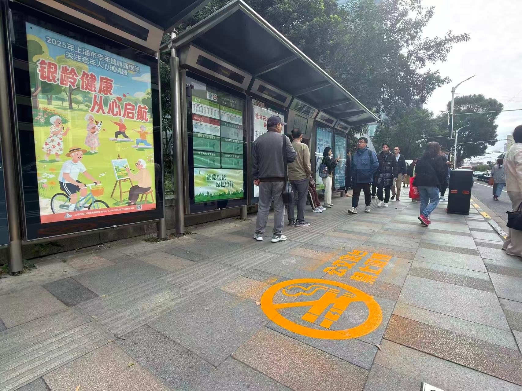 全市首創(chuàng)!上海楊浦區(qū)在部分公交站點(diǎn)試點(diǎn)地面噴繪禁煙提示