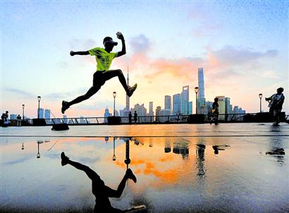 外灘的清晨,一位市民迎著晨曦奔跑!∫曈X中國供圖