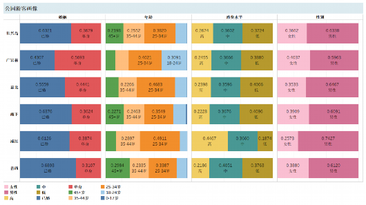 從6座郊野公園來看,已婚游客占比在60%以上。只有廣富林郊野公園,由于緊鄰松江大學(xué)城,單身游客占比超過了50%。在年齡上,25歲至34歲的年輕游客成為“中堅力量”。從性別上看,男性游客占比均超過60%,其中浦江郊野公園的男性游客占比接近75%。