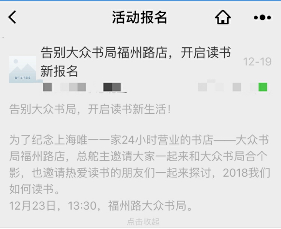 12月19日,福州路大眾書局門口的“致讀者會(huì)員的公開信”讓大家停下了腳步,上面寫道:“感恩六年風(fēng)雨共讀,這家全年24小時(shí)無(wú)休的書店,要打個(gè)盹了。因租約到期,我們的營(yíng)業(yè)時(shí)間截止為2017年12月25日21:00,隨后將與各位作別,擇機(jī)另尋新址!