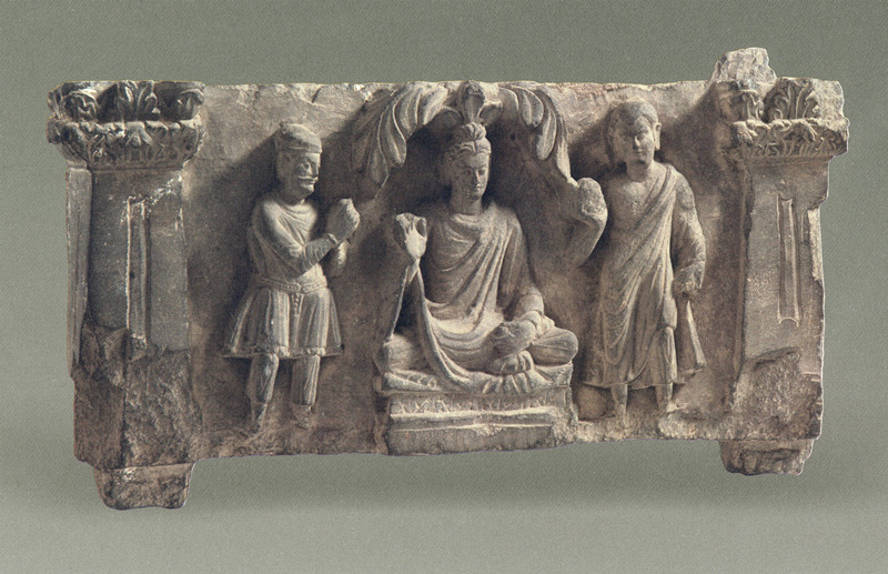 貴霜王朝時(shí)期,對于亞歷山大東征后留下的種種希臘羅馬藝術(shù),對來自西邊的伊朗高原上的瑣羅亞斯德教、東南邊印度半島的印度教和佛教,都采取了兼收并蓄的包容態(tài)度,這極大豐富了貴霜時(shí)期的藝術(shù)表達(dá)方式。展覽中的“豐收女神坐像”是希臘藝術(shù)中常用到的素材,女神衣裙紋線流暢優(yōu)美,右手上舉,左手于膝頭持握豐饒角(Cornucopia),表情慈祥。從此件雕塑中,可以看出希臘藝術(shù)在貴霜地區(qū)的深入影響。另一件展品“禮拜佛陀建筑構(gòu)件”上的浮雕描述了菩薩、供養(yǎng)人共同聆聽釋迦牟尼說講佛法的場景,象征希臘建筑雕塑的科林斯柱頭與講經(jīng)說法場景協(xié)調(diào)于一處。