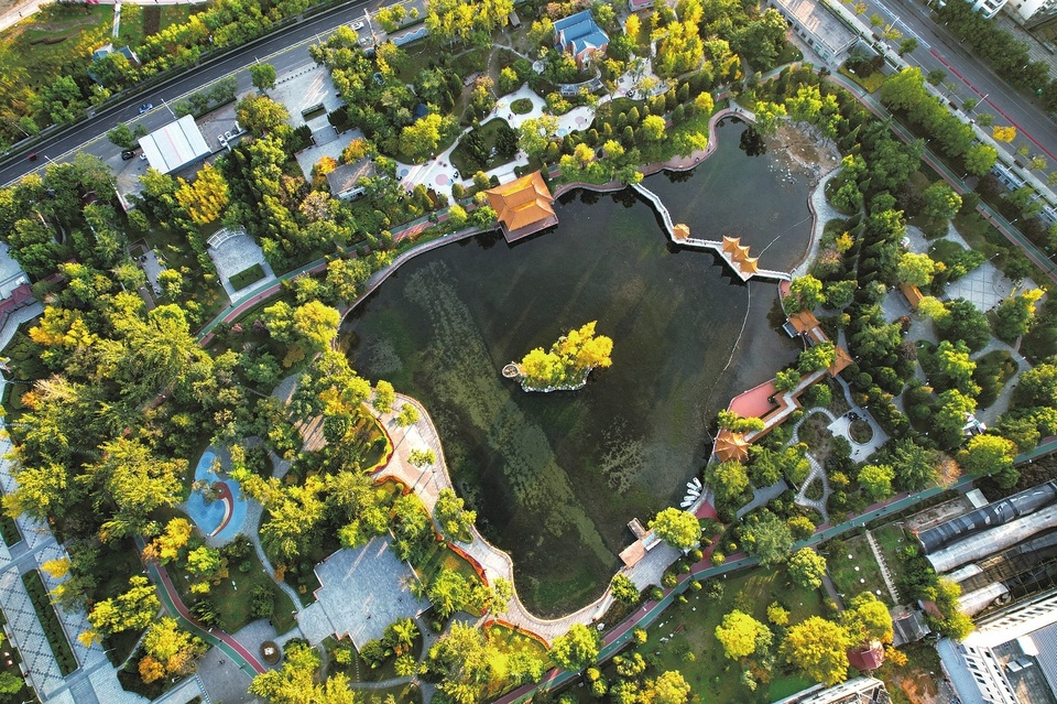 10月29日,陽泉市中心公園疊翠流金、湖橋映景、古建添韻,彰顯“煤鐵之鄉(xiāng)”生態(tài)優(yōu)先的宜居底色。(杜愛清)