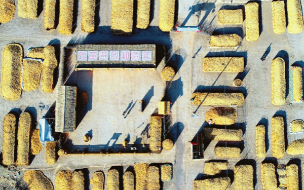 1月17日,俯瞰昔陽縣閆莊鄉(xiāng)閆莊村,豐收廣場格外醒目。為進(jìn)一步挖掘旅游資源,閆莊鄉(xiāng)別出心裁,在閆莊村口18余畝的玉米堆場上用10余萬穗、2萬余公斤玉米,打造出一個(gè)別具特色的豐收廣場,
