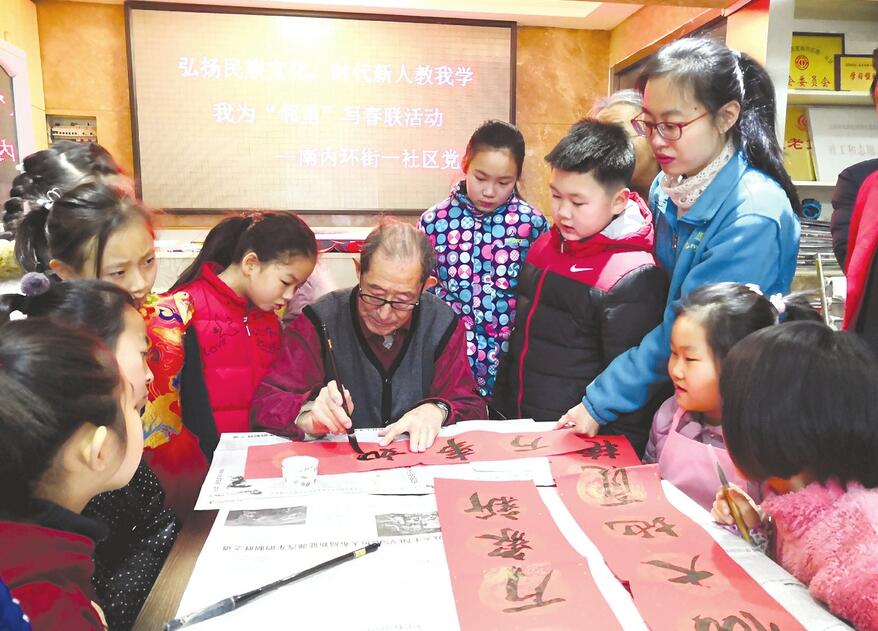 當日,太原市迎澤區(qū)南內(nèi)環(huán)一社區(qū)舉辦“弘揚民族文化,時代新人教我學(xué)——我為鄰里寫春聯(lián)”活動,86歲的退休干部李興玉現(xiàn)場示范,向放寒假的孩子們傳授書法技藝,并和孩子們一起書寫了數(shù)十副春聯(lián)。
