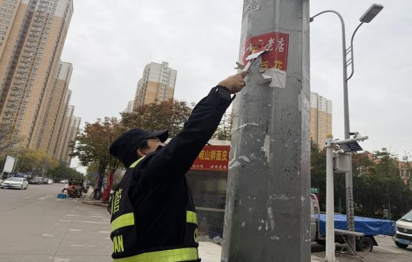 工作人員清理亂貼小廣告(陳倉(cāng)區(qū)委宣傳部供圖)