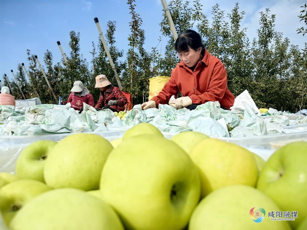 淳化榮基云錦現(xiàn)代果業(yè)示范園里工人們正在分揀瑞雪蘋果。