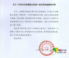 2017年2月,一則“中學(xué)語文教材出現(xiàn)黃色網(wǎng)站鏈接”的新聞被多家媒體報(bào)道和轉(zhuǎn)載,引起輿論高度關(guān)注。據(jù)多名網(wǎng)友爆料,在人民教育出版社出版的高中語文選修教材《中國古代詩歌散文欣賞》中所提供的一個(gè)參考網(wǎng)址,經(jīng)網(wǎng)友訪問發(fā)現(xiàn)其指向的是一個(gè)黃色網(wǎng)站。