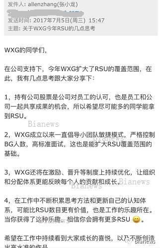 據(jù)BiaNews報道,張小龍近日下發(fā)的內(nèi)部郵件顯示,在公司的支持下,WXG得以擴大RSU(受限股票單位)的覆蓋范圍,希望盡可能多的員工獲得RSU。