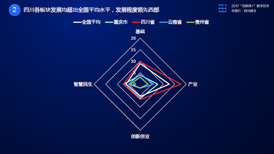 四川省的互聯(lián)網(wǎng)+數(shù)字經(jīng)濟(jì)基礎(chǔ)指數(shù)、產(chǎn)業(yè)指數(shù)、創(chuàng)新創(chuàng)業(yè)指數(shù)、智慧民生指數(shù)均取得了長足、均衡發(fā)展。四大板塊的發(fā)展均超出全國平均水平,并領(lǐng)先于重慶、云南、貴州。特別是產(chǎn)業(yè)指數(shù),領(lǐng)先優(yōu)勢尤為明顯。