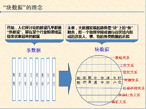 與之相比,塊數(shù)據(jù)是在一個物理空間或者行政區(qū)域形成的涉及到人、事、物等各類數(shù)據(jù)的綜合,相當(dāng)于將各類“條數(shù)據(jù)”解構(gòu)、交叉、融合。在塊數(shù)據(jù)集合過程中,包含了數(shù)據(jù)空間的填充、空間數(shù)據(jù)的重構(gòu)、集合過程的組構(gòu),及組構(gòu)過程中的集合,同時還有新數(shù)據(jù)的匯集和原有數(shù)據(jù)組合后的衍生數(shù)據(jù)。塊數(shù)據(jù)概念的提出和應(yīng)用,使我們對大數(shù)據(jù)的挖掘?qū)崿F(xiàn)了從混沌到精準。