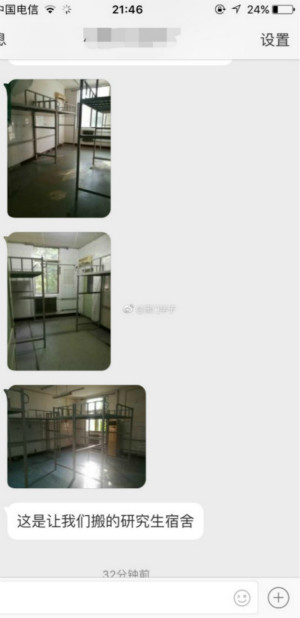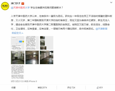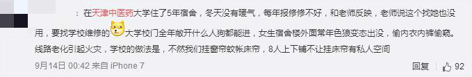 央廣網(wǎng)天津9月15日消息(記者陳慶濱 夏震宇 褚夫晴)近日,天津中醫(yī)藥大學(xué)搬遷宿舍事件持續(xù)發(fā)酵,多名天津中醫(yī)藥大學(xué)的學(xué)生在@津門學(xué)子、@奏耐天津等微博賬號爆料稱,作為研究生,新學(xué)期他們將無法住在校內(nèi),而是統(tǒng)一被學(xué)校強(qiáng)制性搬入中醫(yī)第二附屬醫(yī)院的老院區(qū)住宿。同學(xué)們吐槽稱:老院區(qū)又臟又破,蚊蟲滋生,線路老化,衛(wèi)生堪憂,沒有食堂,沒有浴室,一層樓只有兩個(gè)蹲位廁所,條件極其惡劣。爆料共計(jì)形成了近4000次轉(zhuǎn)發(fā),3000次評論。