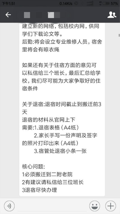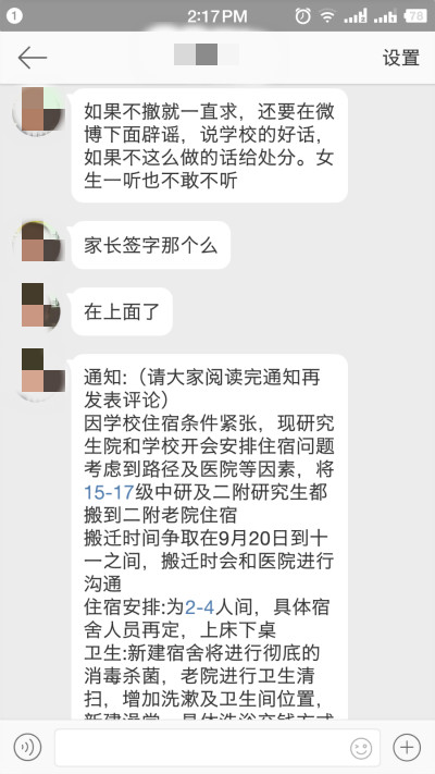 一位不愿透露姓名的中醫(yī)藥學(xué)生稱,學(xué)校并未前期通知她們要搬遷宿舍,13日晚,搬遷通知才在微信群里傳播。通知要求搬遷時(shí)間爭取在9月20日到十一之間,核心問題是必須搬遷到二附老院且退宿盡快辦理。如果不想搬遷可申請退宿,退宿后發(fā)生的意外事故而致傷亡的一切后果,學(xué)校將不予承擔(dān)。記者了解到,從事件開始到現(xiàn)在,學(xué)校并未有相關(guān)責(zé)任人出面安撫學(xué)生情緒,且受訪學(xué)生告知央廣記者,輿情高漲后,學(xué)校卻讓他們盡快辦理退宿。
