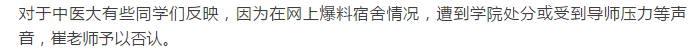 受訪學(xué)生告知央廣記者,他們了解到有同學(xué)因在網(wǎng)上爆料而陸續(xù)被約談或者寫檢討,并被要求申請小號“洗白“,這與微博反應(yīng)的情況相似。該情況與中醫(yī)藥宣傳部崔老師接受其他媒體采訪時(shí)所述情況有些不符。