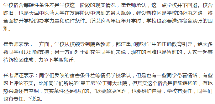 為此,天津中醫(yī)藥大學(xué)黨委宣傳部崔老師表示,學(xué)校宿舍等硬件條件差是這一階段現(xiàn)實(shí)情況,因?yàn)閳F(tuán)泊新校區(qū)工程掃尾等多方面問題,目前新校區(qū)暫不具備入住條件。困難是暫時(shí)的,等新校區(qū)建成,力爭下學(xué)期搬遷。他表示同學(xué)們反應(yīng)的“民工房”也是有一些同學(xué)帶著情緒,有些網(wǎng)上評論不實(shí)。