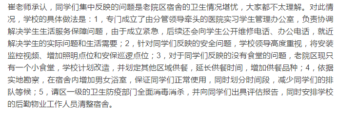 面對洶涌而來的輿論,14日晚,天津中醫(yī)藥大學(xué)在官方微博中發(fā)布一則說明稱:學(xué)校在新學(xué)期開學(xué)前夕,經(jīng)學(xué)校研究,將部分在醫(yī)院實(shí)習(xí)規(guī)培的學(xué)生安排至我校二附院住宿。為保障在醫(yī)院住宿學(xué)生的安全和正常的學(xué)習(xí)生活,學(xué)校事先做了精心部署和周密安排。已采取以下措施:成立了醫(yī)院實(shí)習(xí)學(xué)生管理服務(wù)辦公室,專門負(fù)責(zé)協(xié)調(diào)解決學(xué)生生活服務(wù)保障。針對目前醫(yī)院現(xiàn)有情況,加強(qiáng)學(xué)生安全保障,改善生活條件。宿舍區(qū)在原有基礎(chǔ)上加裝視頻監(jiān)控,增加實(shí)習(xí)學(xué)生安全;食堂正在進(jìn)行改造,在原來基礎(chǔ)上增加供餐區(qū)域,延長供餐時(shí)間;在宿舍樓分別改建男女預(yù)賽,滿足同學(xué)們洗浴需要;聘請專門的衛(wèi)生防疫部門對宿舍區(qū)域進(jìn)行全民衛(wèi)生消殺。對宿舍區(qū)域環(huán)境進(jìn)行大清整,盡可能為同學(xué)提供室外休閑空間。