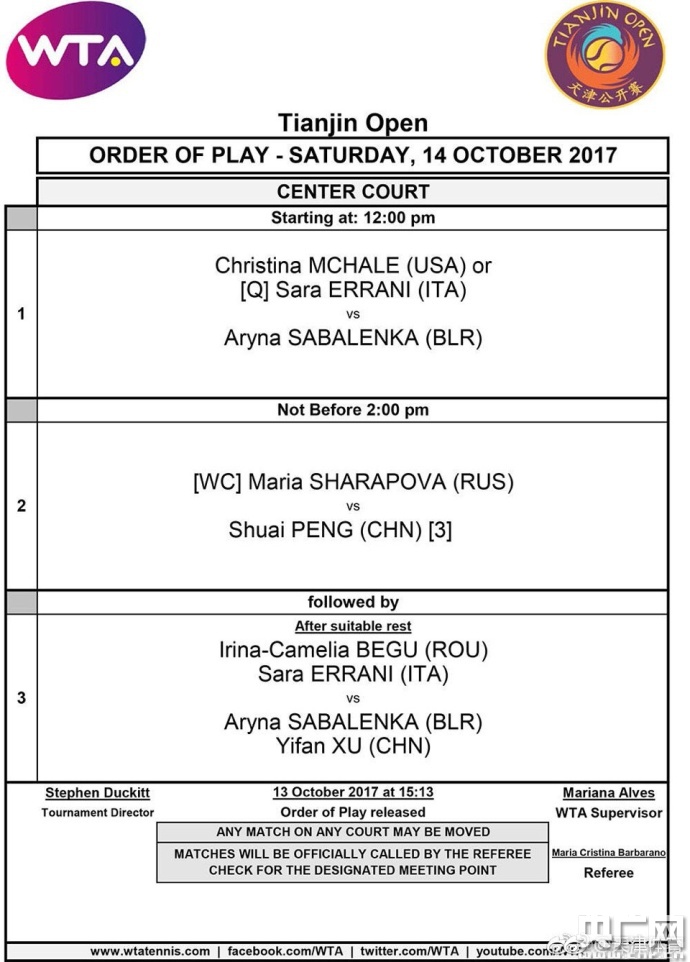 央廣網(wǎng)天津10月13日消息 WTA國(guó)際賽中國(guó)天津公開賽今日展開女單1/4決賽的爭(zhēng)奪。持外卡參賽的俄羅斯美女莎拉波娃在比賽中連下7局,最終直落兩盤以6-3和6-1擊敗瑞士選手沃格勒,成功晉級(jí)半決賽。莎拉波娃在半決賽中的對(duì)手將是中國(guó)金花彭帥。賽后的新聞發(fā)布會(huì)上,莎拉波娃表示與衛(wèi)冕冠軍彭帥的比賽將非常艱難,“我沒有太多的期待,就是希望能夠回來打比賽,繼續(xù)競(jìng)爭(zhēng)。我的目標(biāo)就是能打越來越多的比賽。”