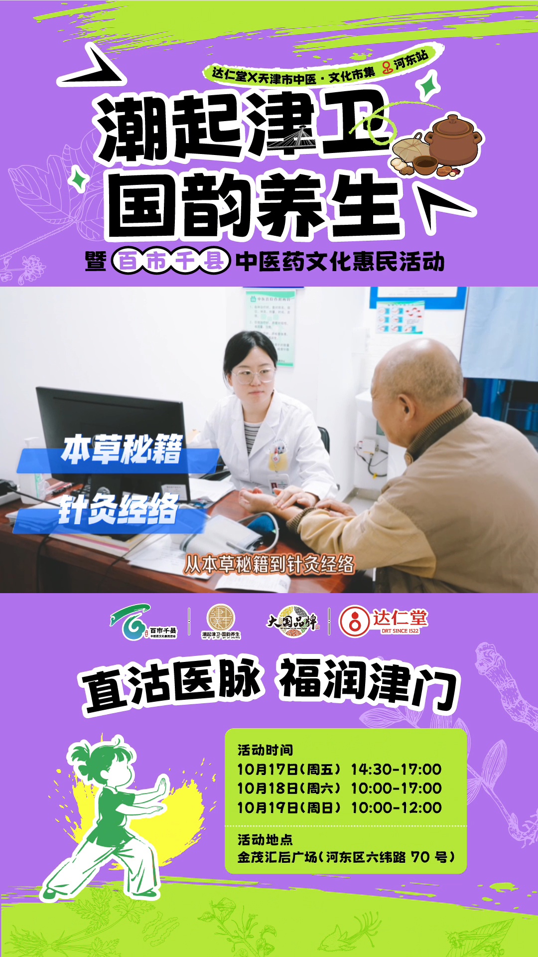 10月17日至19日,由津藥達(dá)仁堂獨(dú)家總冠名的“潮起津衛(wèi)·國韻養(yǎng)生”天津市中醫(yī)文化市集河?xùn)|站將隆重舉行。